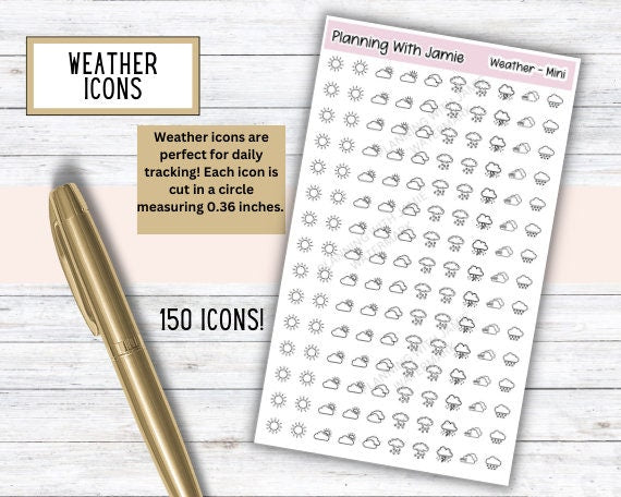 150 WEATHER STICKERS ON ONE STICKER SHEET!!!! Each sticker is approximately 0.36 inch tall - cut out as a clean circle. On sticker sheet approximately 4.3 x 7.3 inches.