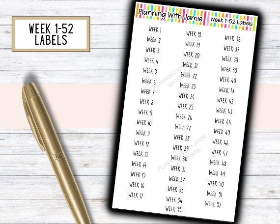 Week 1-52 Script Stickers, Weekly Label Stickers, Planner Stickers, Mom Planning Stickers, Weeks of the Year Stickers